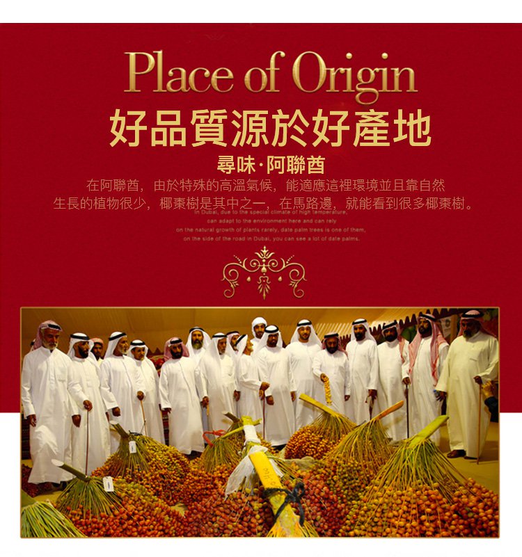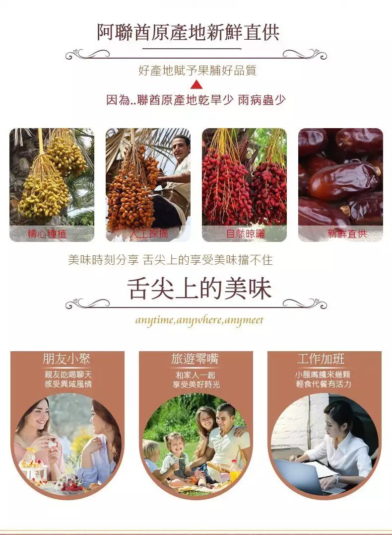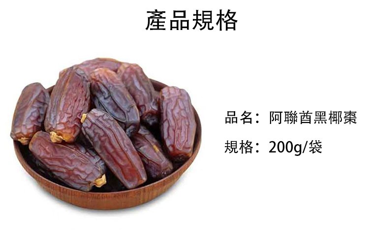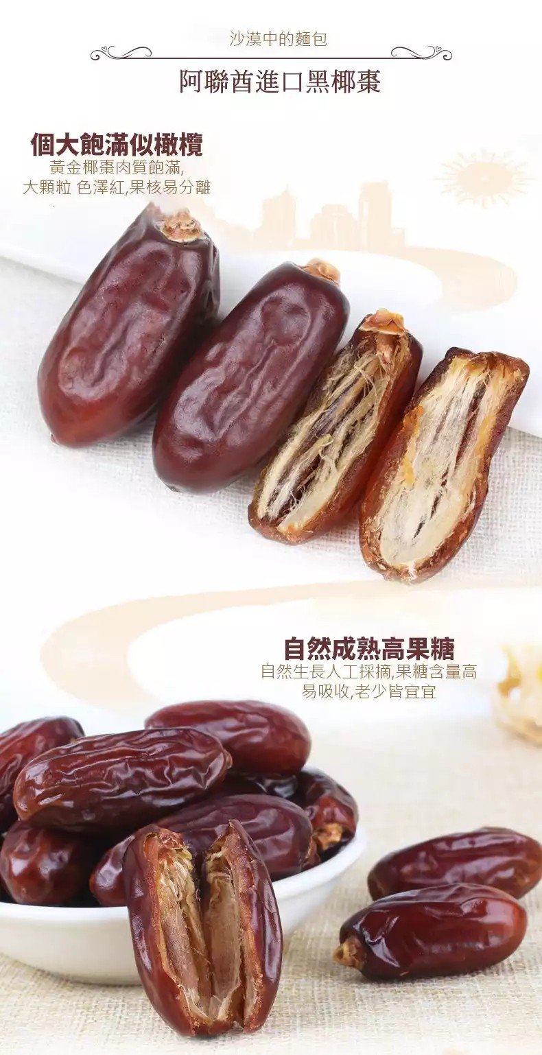 阿聯酋當地的黑椰棗不僅營養豐富,更有著極高藥用價值,對糖尿病、血糖异常、膽固醇异常、關節疼痛,包括對高血壓、高血脂,甚至是癌症都起到一定的作用。